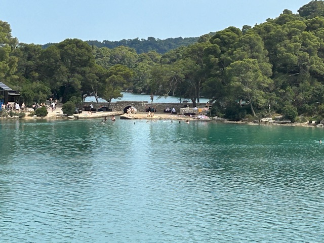 We had time for a late lunch before we set off to explore the National Park. As we lunched a succession of mid-sized cruise ships arrived, one after the other, with fenders out, and proceeded to raft us until there were nine abreast on the quay. It was obvious they were about to discharge a large number of tourists who would want to do the same thing as we did, but we were a bit too tired to immediately get up and walk into the park. Inevitably once we arrived at the ticket office there were hoards of tourists gathering around their guides, or renting bikes to get up to the park. We considered abandoning our visit until the following morning, but decided in the end to continue, and I'm very glad we did. For tickets of €25 each, we got access to the park and access also to golf cart transporter around the lakes and solar pound electric fairies on the lakes as well. There was a 20 to 30 minute walk uphill on broad stone steps to the crest and then down the other side where we found the spectacular little lakes inbred in the cast , landscape. These lakes formed in the limestone cast, linked by many tunnels and underground cabins to fill with freshwater. However, at some point a channel was cut to link them to the sea to get rid of the problem of mosquitoes in these static lakes. We soon came to a small channel between two lakes through which was pouring a fast stream of water as the tires rose. it was very hot but luckily at that point a golf cart transport with seats for a dozen people came past on the perimeter track and we gratefully got on board to be whizzed around the lake to the departure point for the solar ferry. This took us out to the island of Saint Mary , where there is a Benedictine monastery which has since been through various evolutions and tragedies being a hotel. The interior of the basilica was beautiful and calm out of the heat of the Sun and we lit a number of candles in memory of roof, Audrey, Michael, and my mother Alice. From the monastery we caught a ferry back down the lakes through the wooded hilly countryside until we got to the channel that ran into the little lake where we first started.